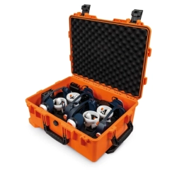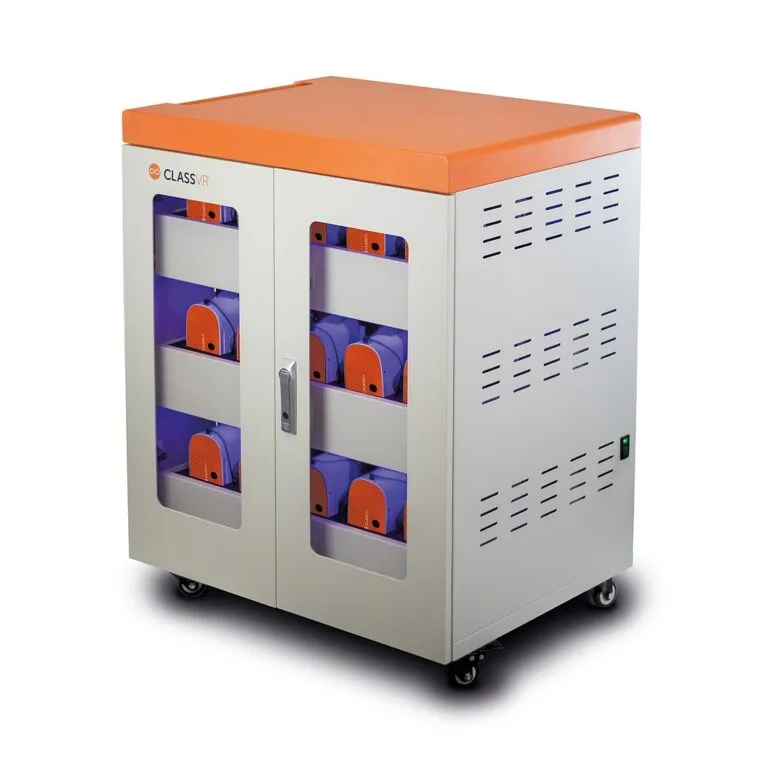 Bezpieczeństwo i higiena (Mobilna szafka): Wózek transportowy służy do ładowania i bezpiecznego przechowywania gogli (posiada blokady i system zapobiegający przewróceniu). Wbudowane światła UV LED automatycznie dezynfekują sprzęt, niszcząc wirusy i zarazki.
